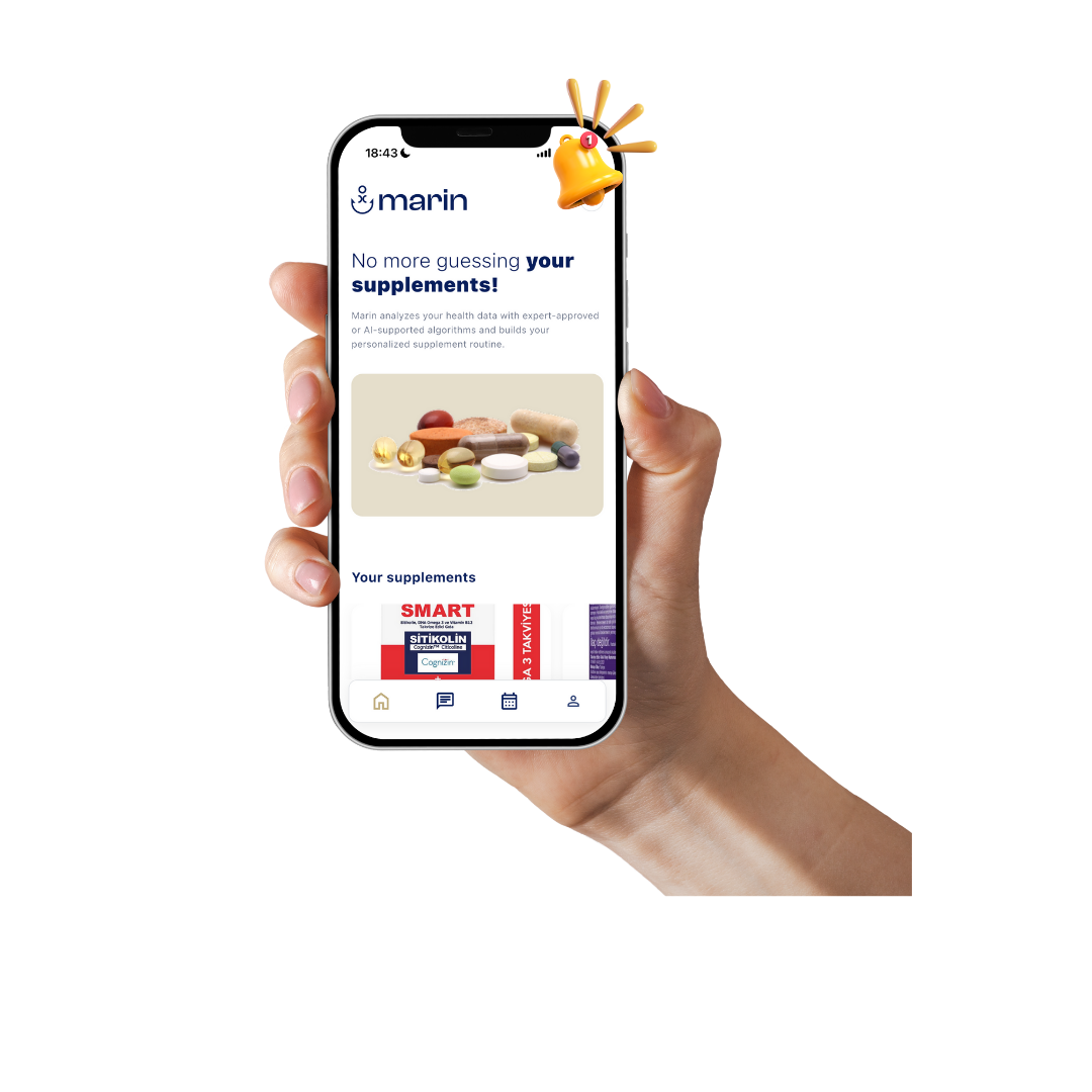 Marin, sağlık profesyonelleri onaylı algoritmasıyla verilerini analiz eder, sana özel takviye rutinini oluşturur.